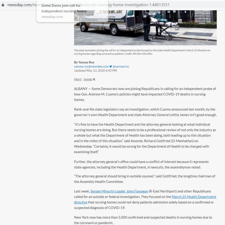 See pasted below a snapshot of an article out of New York discussing an investigation of nursing homes that was recently ordered by the Governor. The investigation is being done by the state Health Department which is being represented by the Attorney General’s Office. Some people have questioned whether the Health Department and the Attorney General are the appropriate departments or offices to be involved in the investigation in this circumstance. In addition to the departments or offices that are involved, I will add that interpersonal relationships can also be or become an issue.