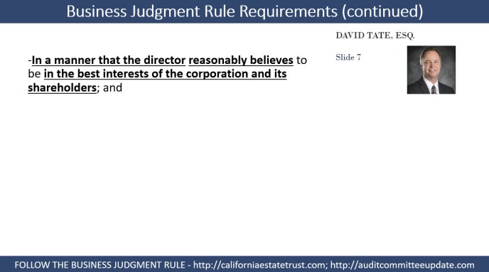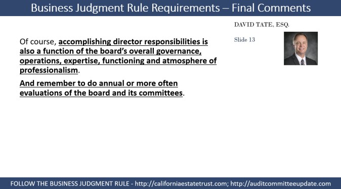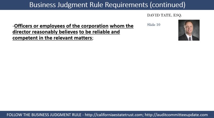 -Review of recent developments relating to the business judgment rule, standard of care and acceptable reliance on other people.