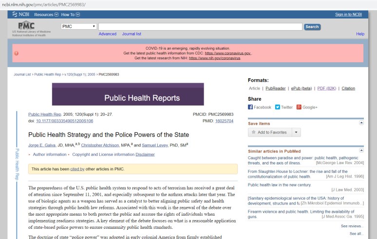 The following is a link to the eight-page article. Note that the discussion in the article isn’t the answer in the current situation that we are seeing because it isn’t written for the current situation, it doesn’t cite all relevant legal authorities, and the current situation will vary from state to state and location to location (e.g., county, city or town, etc.) within each state, but the article is the type of legal discussion and evaluation that we should be seeing and that I would expect and wish to see from the ordering, enacting or enforcing entity, but that I am not seeing. Here is the article link, followed by a snapshot of part of page one from the article: https://www.ncbi.nlm.nih.gov/pmc/articles/PMC2569983/