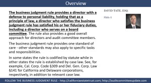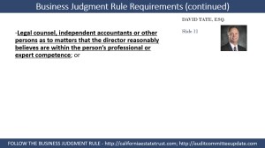-Review of recent developments relating to the business judgment rule, standard of care and acceptable reliance on other people.